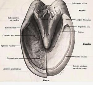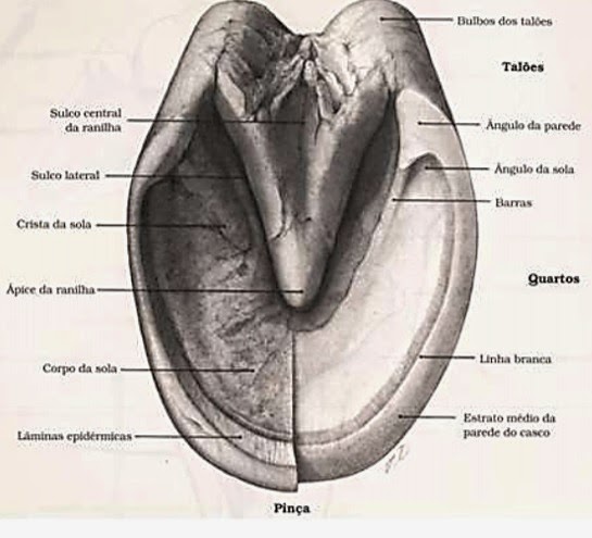 Dividiremos o casco em quatro partes, o casco direito vamos casqueá-lo retirando mais material da parte superior de dentro e inferior de fora, fazendo um V invertido , e o casco esquerdo na parte posterior de fora e superior de dentro.